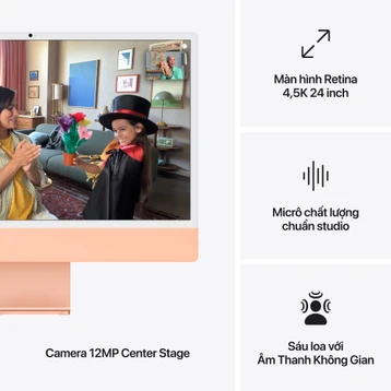 Màn hình Retina 4.5K 24 inch của iMac M4 2024 24 inch đem đến trải nghiệm hình ảnh sắc nét, rực rỡ. Độ phân giải 4.5K cung cấp hình ảnh rõ nét, chi tiết. Dải màu P3 mở rộng cho phép màn hình của iMac M4 2024 hiển thị hơn một tỷ màu sắc, tái hiện trung thực mọi chi tiết hình ảnh. Độ sáng lên đến 500 nits giữ được độ sắc nét và độ rực rỡ trong mọi điều kiện ánh sáng.