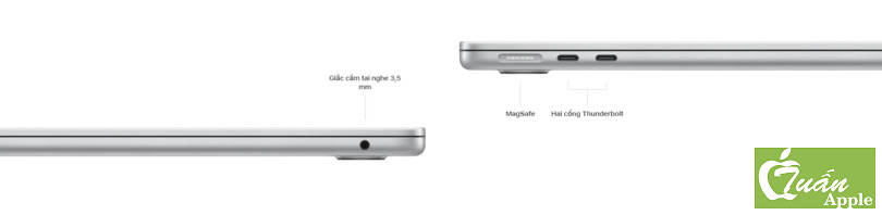 Cổng Masafe hỗ trợ cắm và tháo sạc nam châm nhanh chóng. Hai cổng Thunderbolt cho phép kết nối và sạc pin tốc độ cao cho các phụ kiện, người dùng có thể kết nối với màn hình 6K. Cuối cùng jack cắm tai nghe 3.5 hỗ trợ kết nối với tai nghe trở kháng cao.