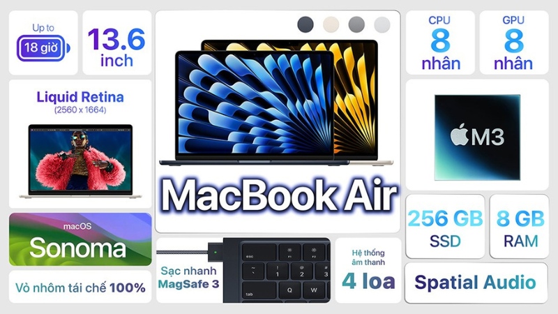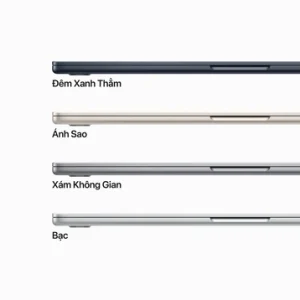 Điểm độc đáo của MacBook Air M3 là sự đa dạng trong việc lựa chọn màu sắc với 4 phiên bản khác nhau: Đêm Xanh Thẳm (Midnight), Ánh Sao (Starlight), Xám Không Gian (Gray), Bạc (Silver). Điều này giúp người dùng dễ dàng lựa chọn theo phong cách và sở thích cá nhân.
