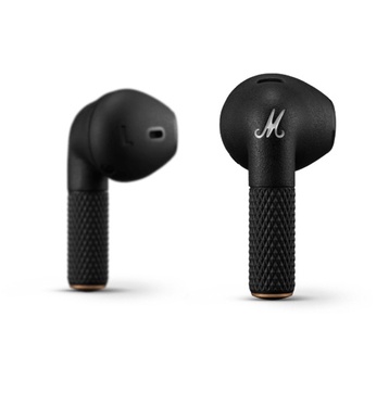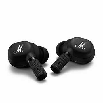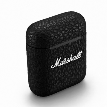 Tai nghe Bluetooth Marshall Minor III có kiểu dáng hiện đại và cá tính với sắc đen. Phần logo chữ M nổi bật in bằng chữ trắng nằm chính giữa tai nghe và in rõ chữ Marshall trên hộp sạc.
